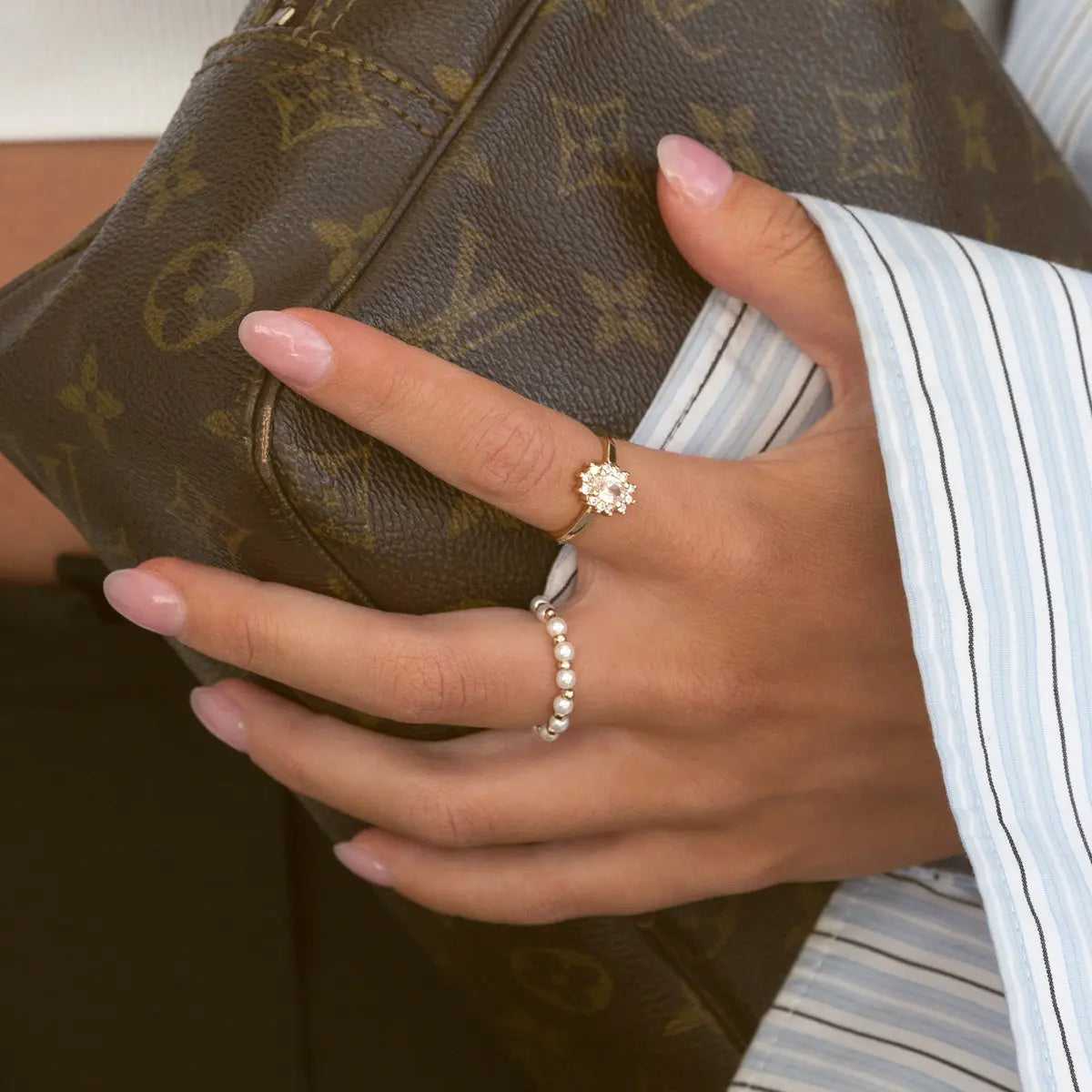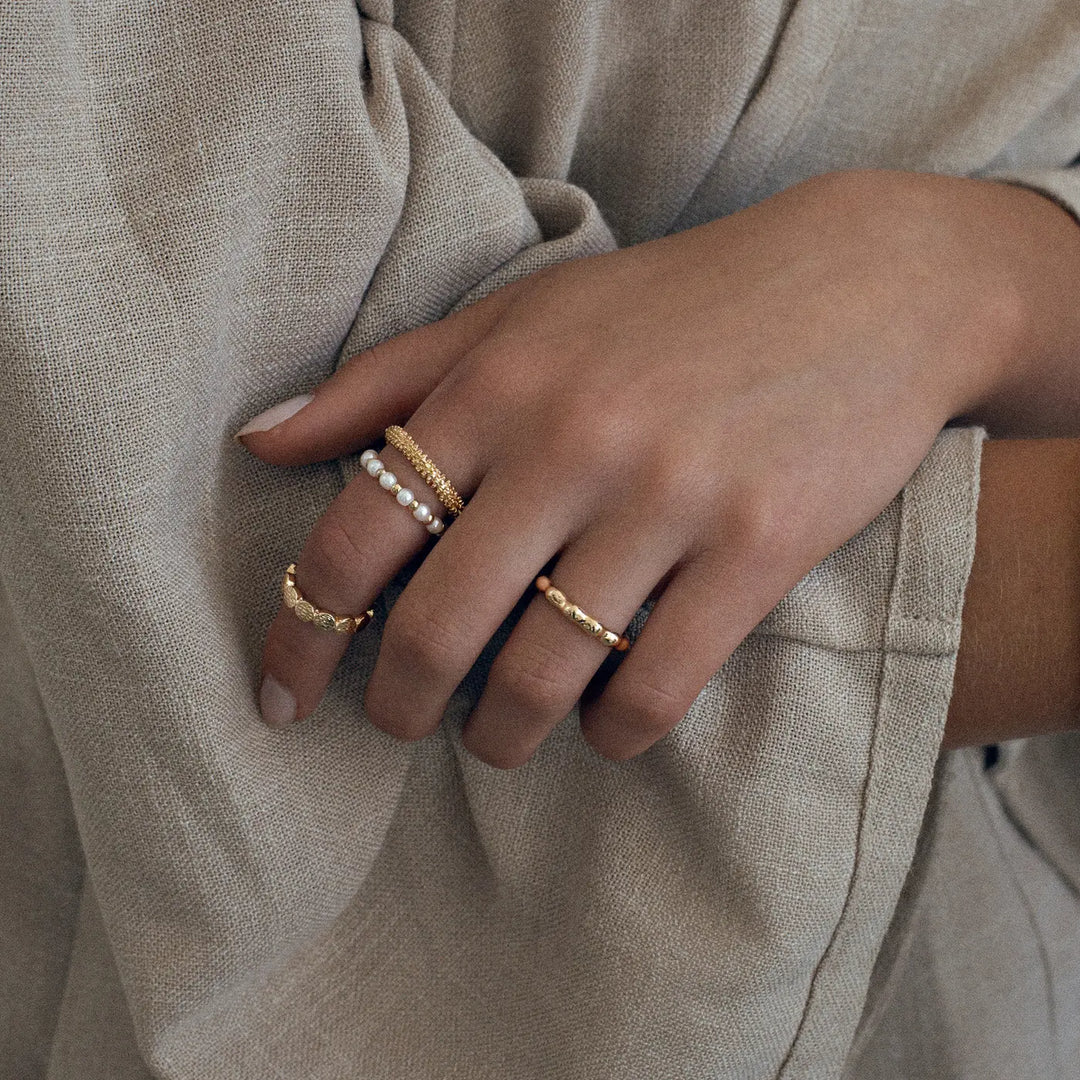 Pearls are always in fashion. Why not have them on your fingers too? Pearl and Gold Bead Ring is the ultimate ring for summer evenings. Our jewellery is always sent in our exclusively designed packaging. Brass with gold plating. Size 17,5mm. Free from lead, nickel and cadmium