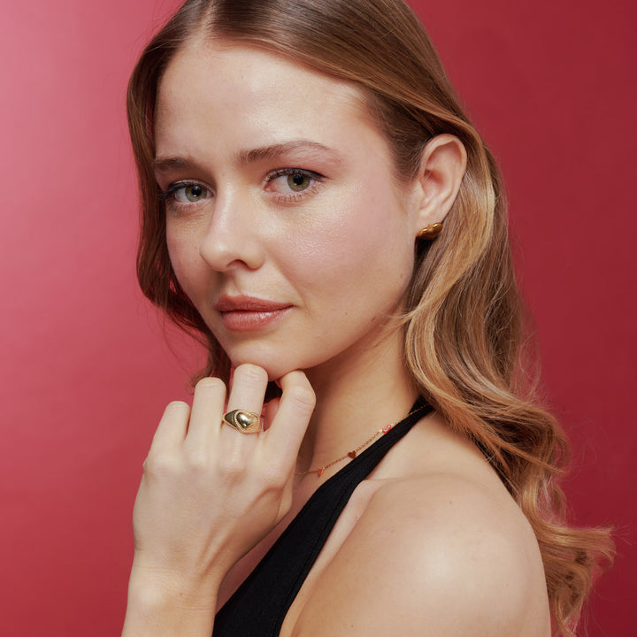 A modern twist on a timeless classic, this adjustable gold signet ring is crafted from brass and plated with real gold for that luxe finish. The bold heart design adds a touch of confidence and individuality, making it the ultimate statement piece. Whether you’re sealing deals or stealing hearts, this ring says, “I’m here to make an impression - and I’ll look flawless doing it.