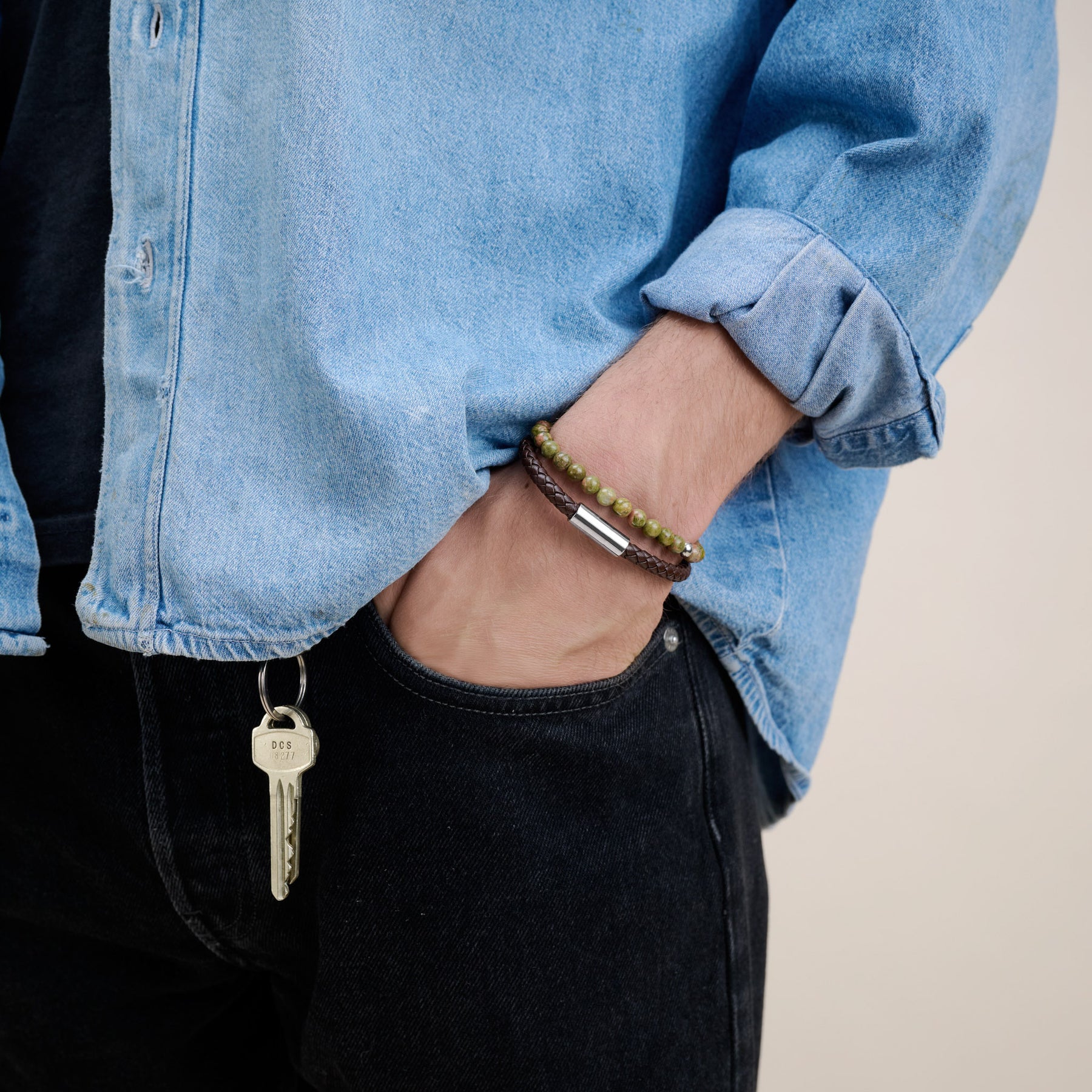 A classic blend of materials with this leather bracelet for men. This bracelet combines durable soft leather with stainless steel accents for a timeless and versatile look.