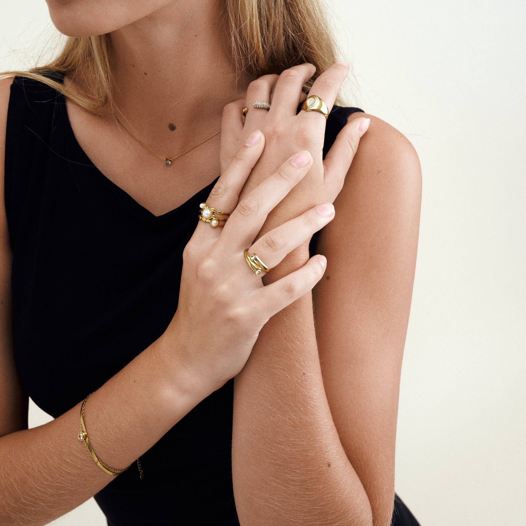 Elegant design with this open crystal ring. Featuring sparkling crystals, this adjustable stainless steel ring is water-resistant and tarnish-free for a flexible fit.