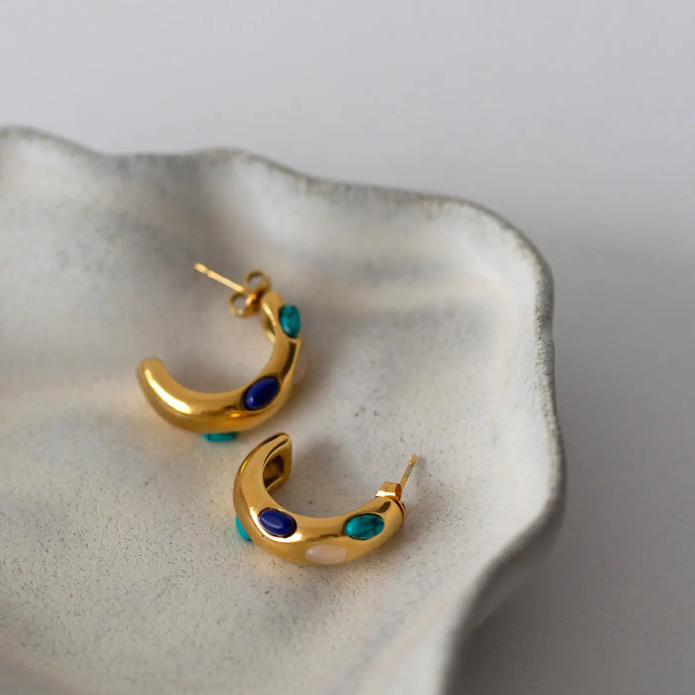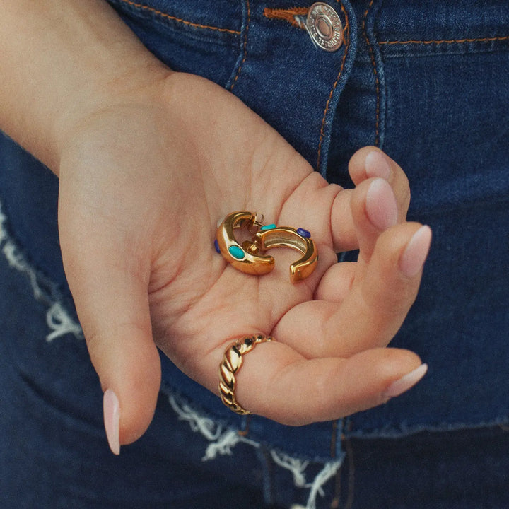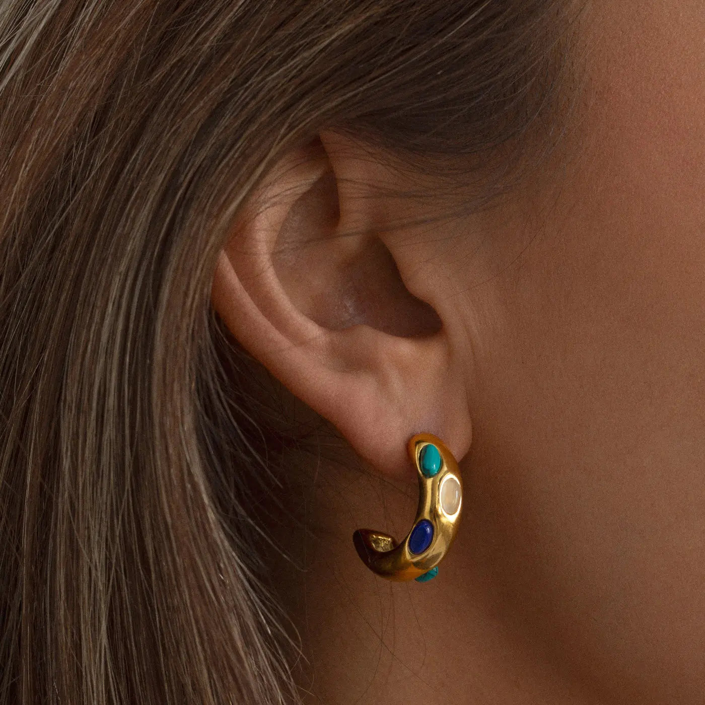 We took a pair of timeless earrings and made them even more special, by molding magical semi precious stones into the hoop. A must have in the jewellery box.