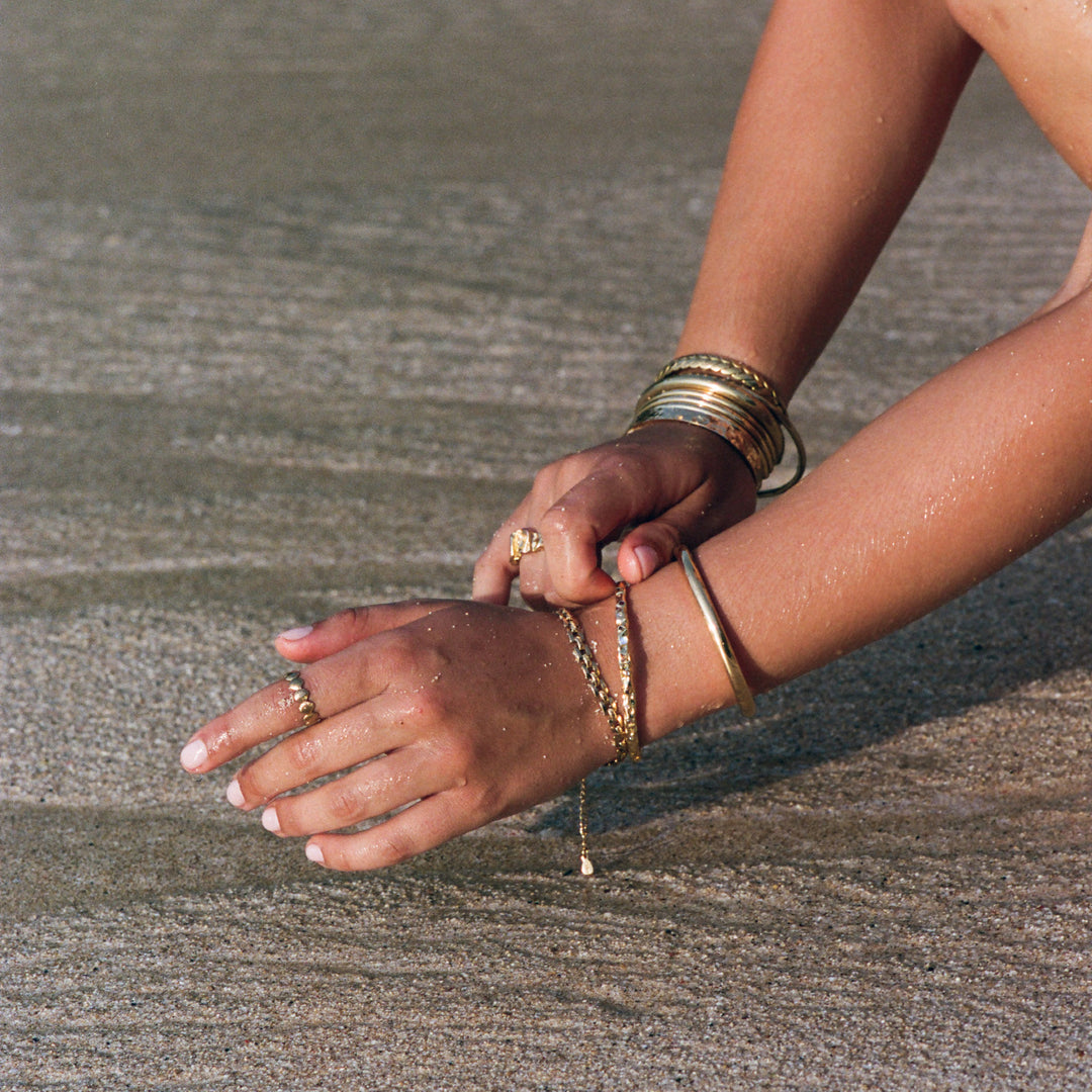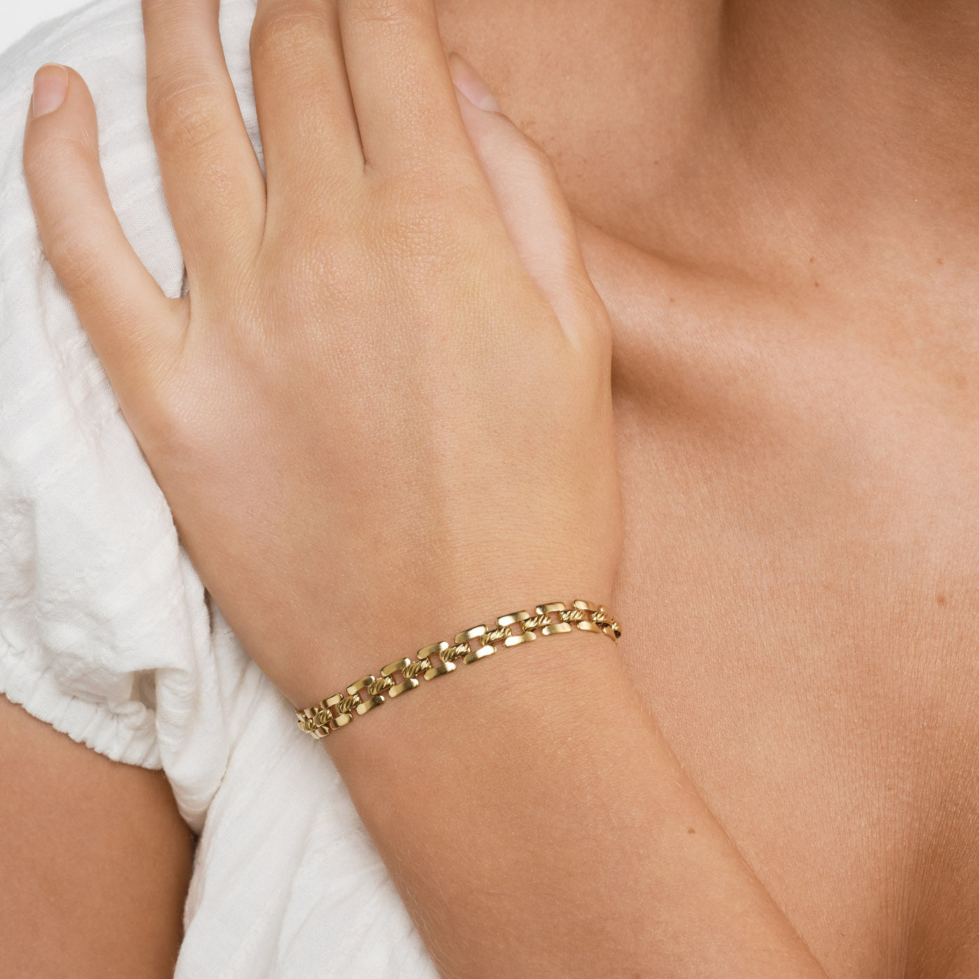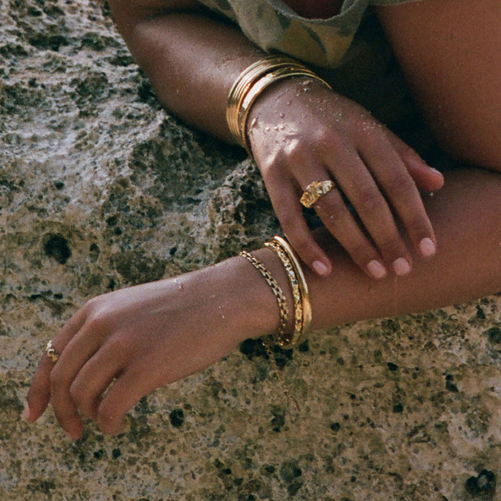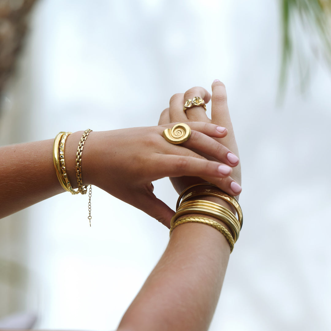 Chunky, classic, and here to stay. Olivia Bismarck bracelet in waterproof stainless steel brings solid edge to your wrist game. Available in gold and silver to match your style and needs.