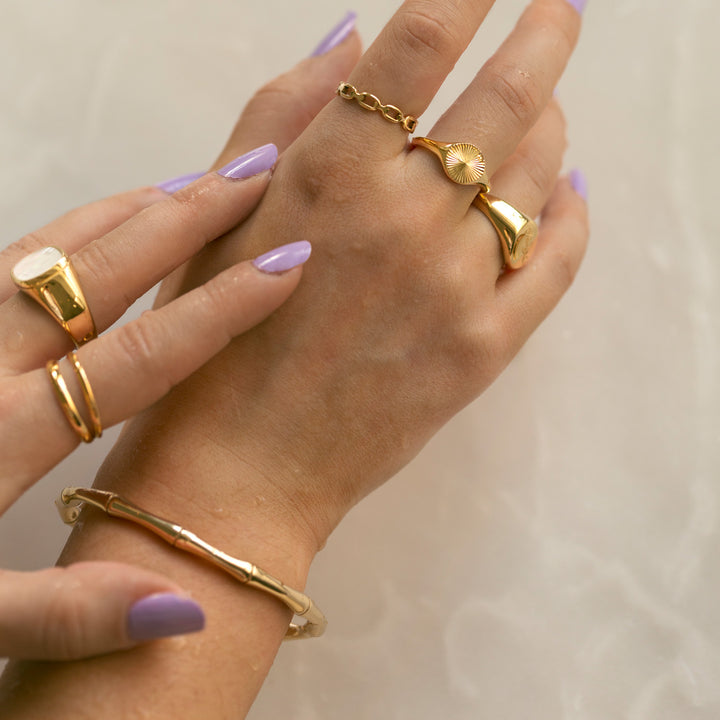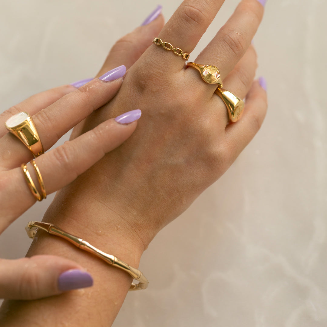 Make a subtle statement with Tyra. This bamboo inspired arm cuff / bangle bracelet in waterproof stainless steel brings a natural twist to your everyday stack. Sleek, lightweight and peeeerfect for layering.