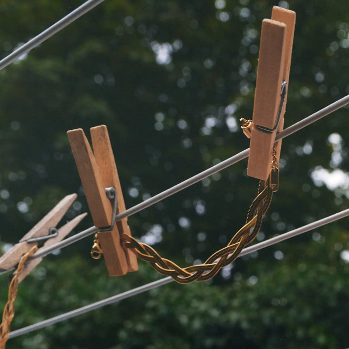 Schauen Sie sich diese wunderschöne geflochtene Halskette an. Ein wahres Statement-Stück. Das Beste daran ist, dass die Halskette aus Edelstahl besteht und mit 18-karätigem Echtgold vergoldet ist. Mit anderen Worten: Es ist wasserbeständig und läuft nicht an.