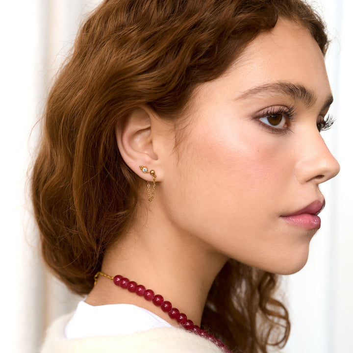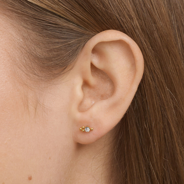 Zart und dennoch auffällig, zeigen diese minimalistischen Ohrstecker einen zentralen Kristall, umrahmt von winzigen goldenen Kugeln. Gefertigt aus hochwertigen, waterproof Materialien, sind sie perfekt für den täglichen Gebrauch – egal ob im Fitnessstudio, unter der Dusche oder beim Schwimmen.