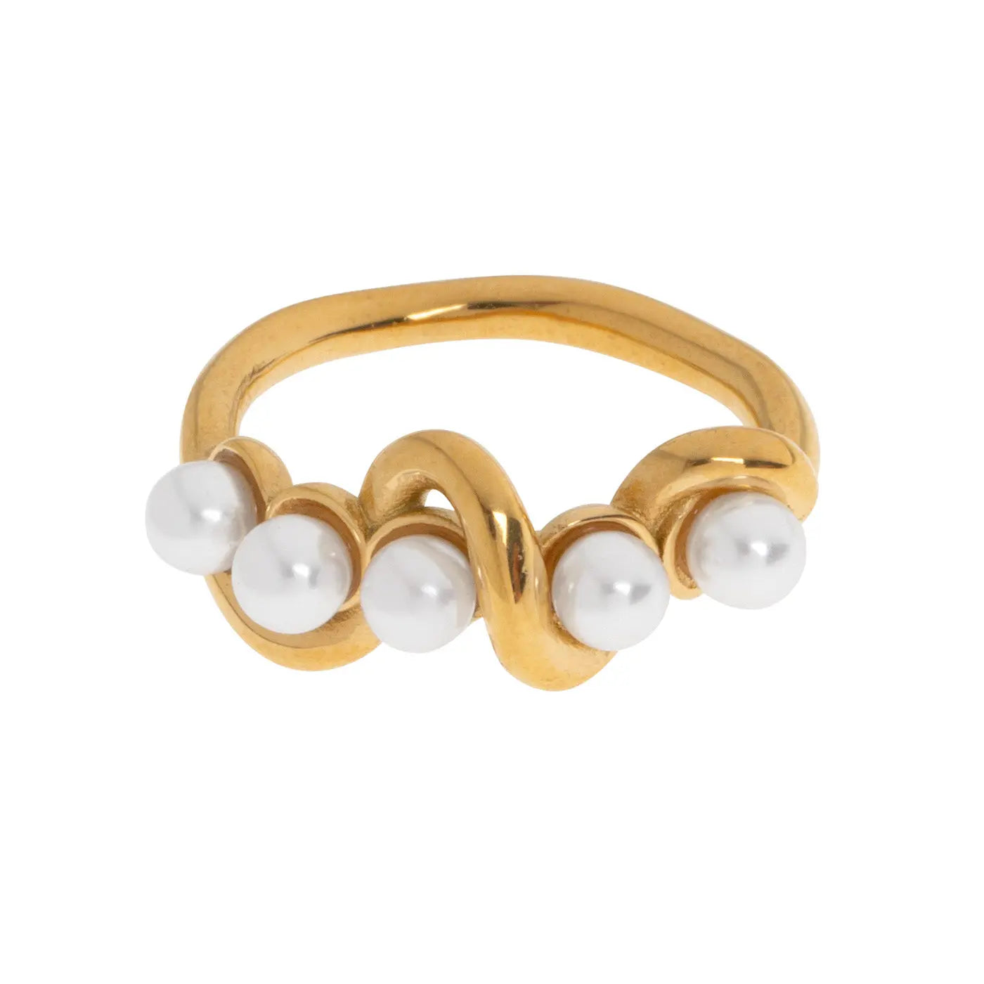 Dieser wunderschöne Ring ist mit fünf Kunstperlen besetzt, die auf einem asymmetrischen Goldband platziert sind. Ein wunderschöner Ring, der Ihr Outfit aufwerten wird. Ein edles Stück auf jeden Fall.