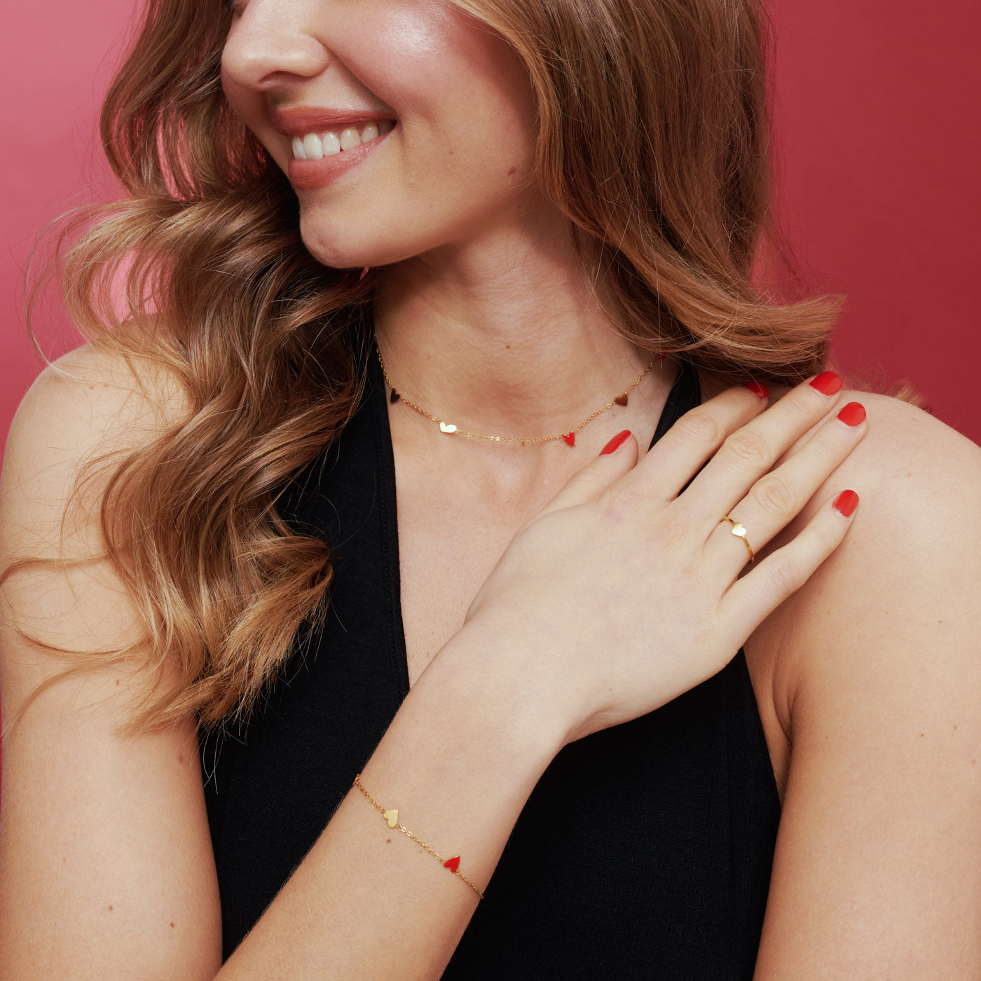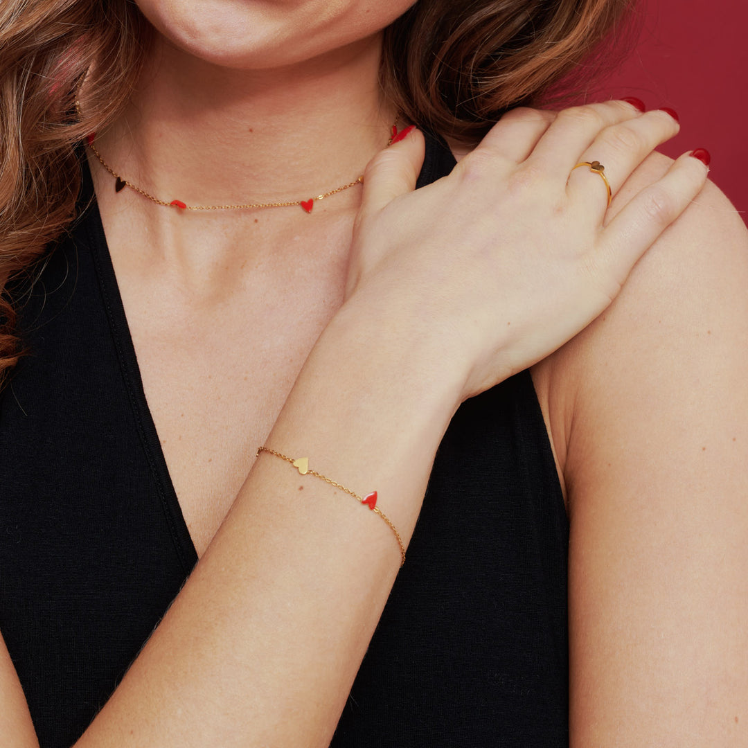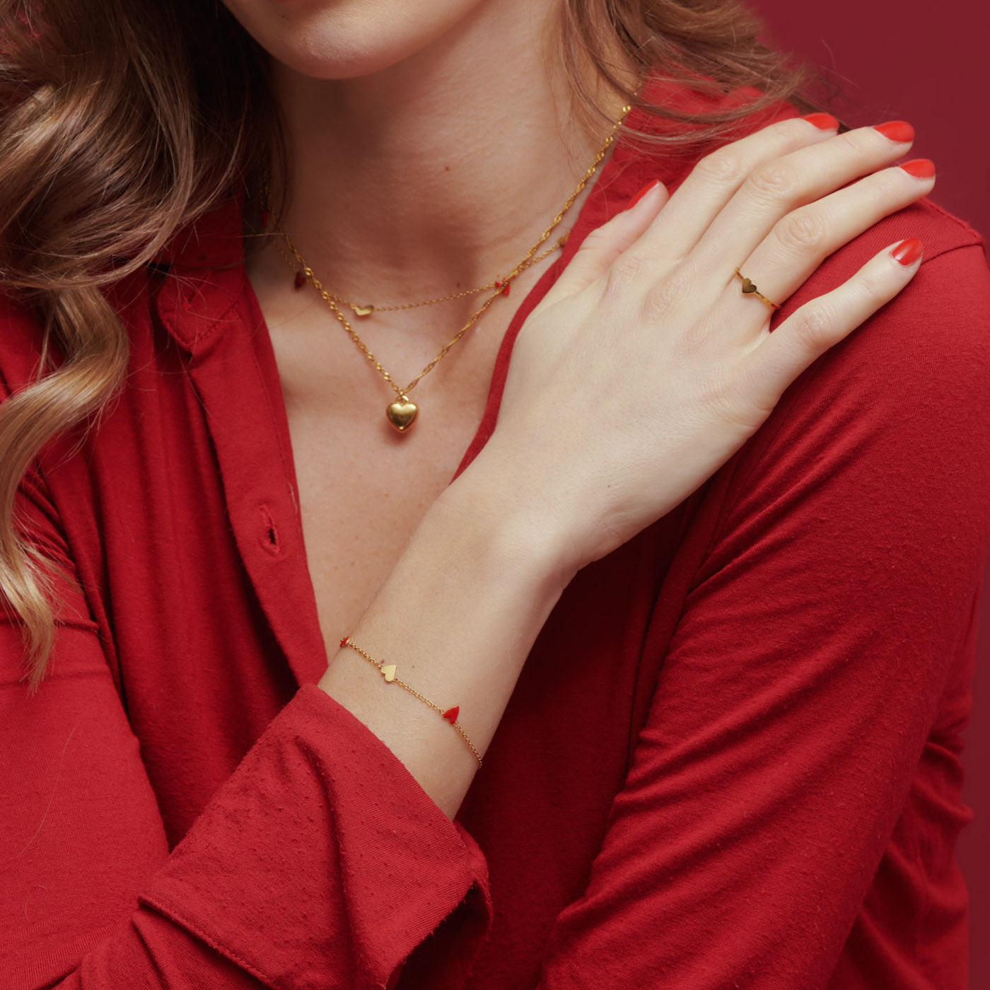 Dieses rot-goldene Herzarmband ist das ultimative Statement-Stück. Es ist aus wasserbeständigem Edelstahl gefertigt und eignet sich perfekt, um Ihre verspielte, kühne Seite zu zeigen - oder um Ihrem Schmuckstapel einen süßen Farbklecks hinzuzufügen.